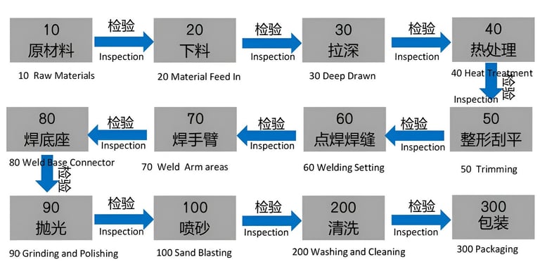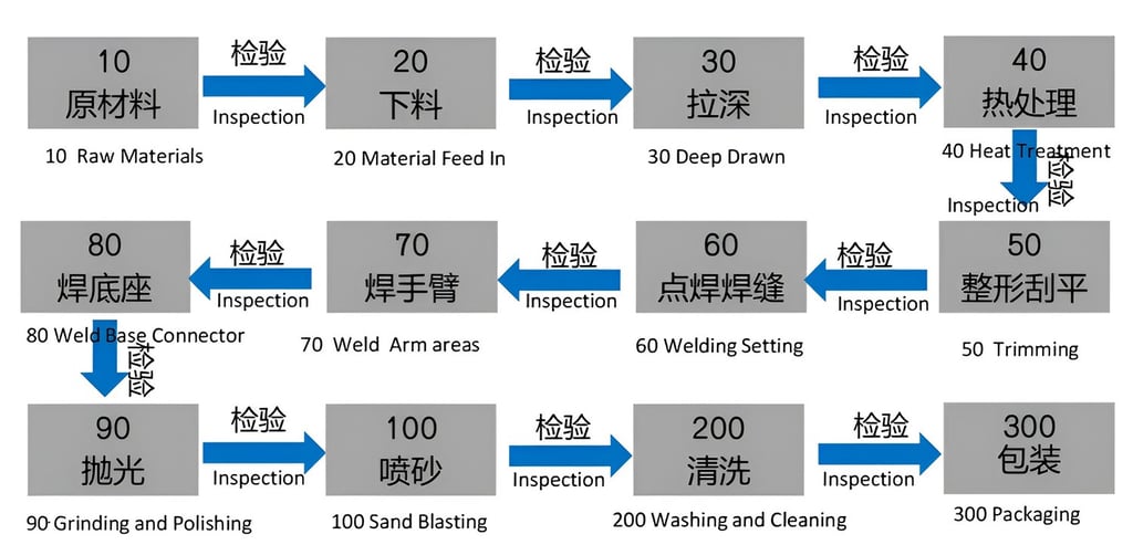 Key processes include: deep drawing, welding, polishing, sandblasting, annealing, solid solution heat treatment, and surface treatment.